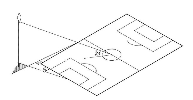 b) 采用场地四角布置方式时,灯杆底部到场地边线中点的连线与场地边线之间的夹角不应小于5°,且灯杆底部到底线中点的连线与底线之间的夹角不应小于15°,灯具高度应满足灯拍最低一排灯具到场地中心的连线与场地平面之间的夹角不应小于25°。