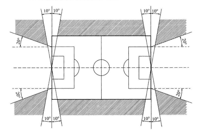 c)采用场地两侧马道布置方式时,灯具不家布置在球门中心点沿底线两侧10°的范围,以及大禁区2端外侧20°范围内;