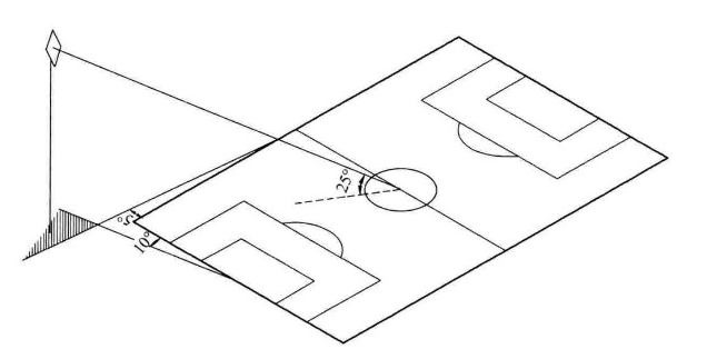 a)采用场地两侧灯杆布置方式时,灯具不宜中心点沿底线两侧10°的范围内,灯杆底音线之间的距离不应小于4m,灯具高度宜满,地中心线的垂直连线与场地平面之间的夹25°;