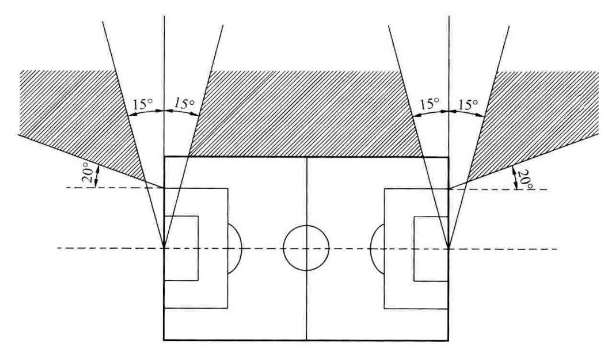 a) 采用场地两侧布置方式时,灯具不应布置在球门中心点沿底线两侧15°以及大禁区两端外侧20°范围内);