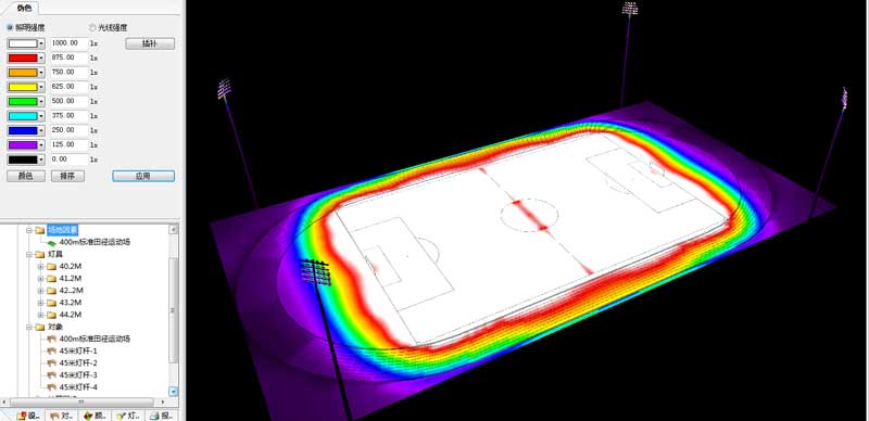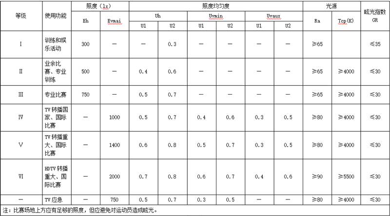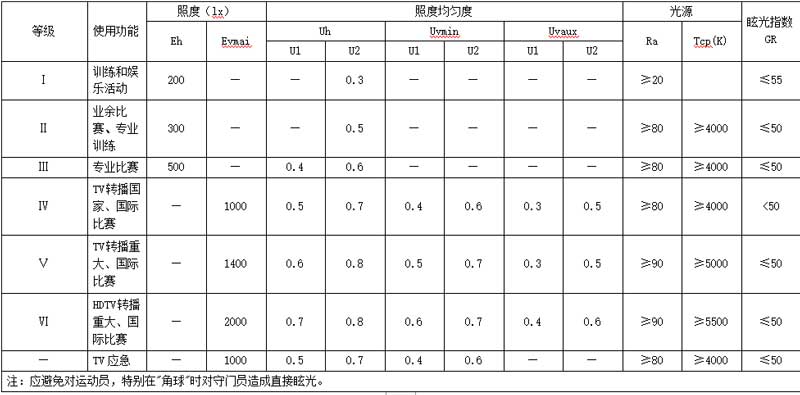 3、足球场的照度可分为:室外足球场和室内足球场,室外(内)足球场的照度标准如下:训练和娱乐活动照度200lx300lx),业余比赛300lx500lx,专业比赛500lx750lx),一般tv转播1000lx1000lx,大型国际比赛高清电视转播1400lx1400lx,tv应急的1000lx750lx)。