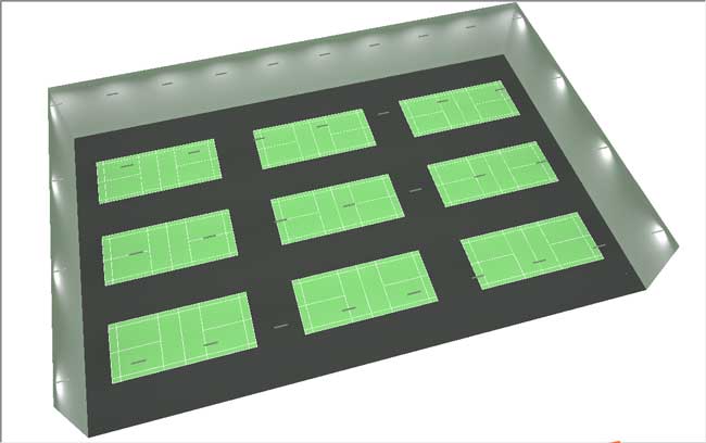 1、以顶棚上的灯具(LED室内球场灯)作一般照明,再从球网两侧较高的位置增加辅助透光照明;
