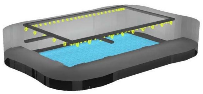 室内跳水馆为例,一般不在水面上方布置游泳馆照明灯,可布置在水面上方以外的吊顶下,屋架下或墙壁上,也可以采用光带式布置。布置游泳池专用灯时候要注意眩光的控制,由于水介质特有的光学特性,必须要考虑以下几个问题: